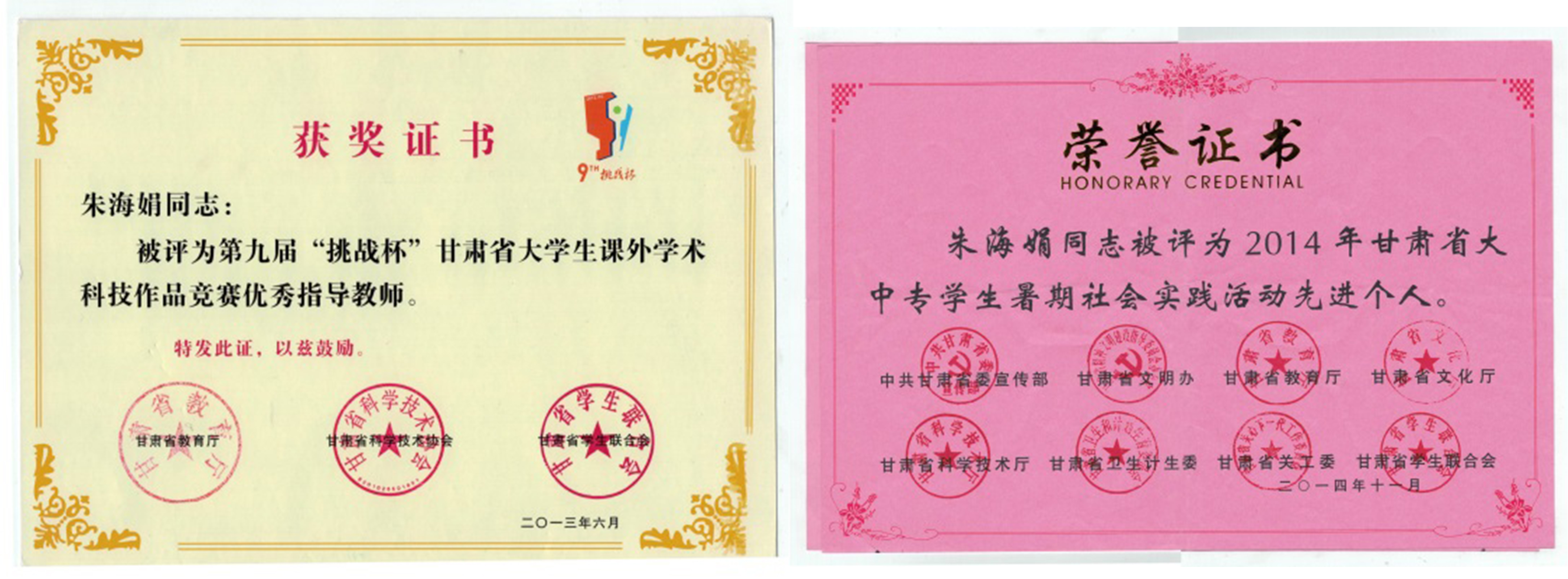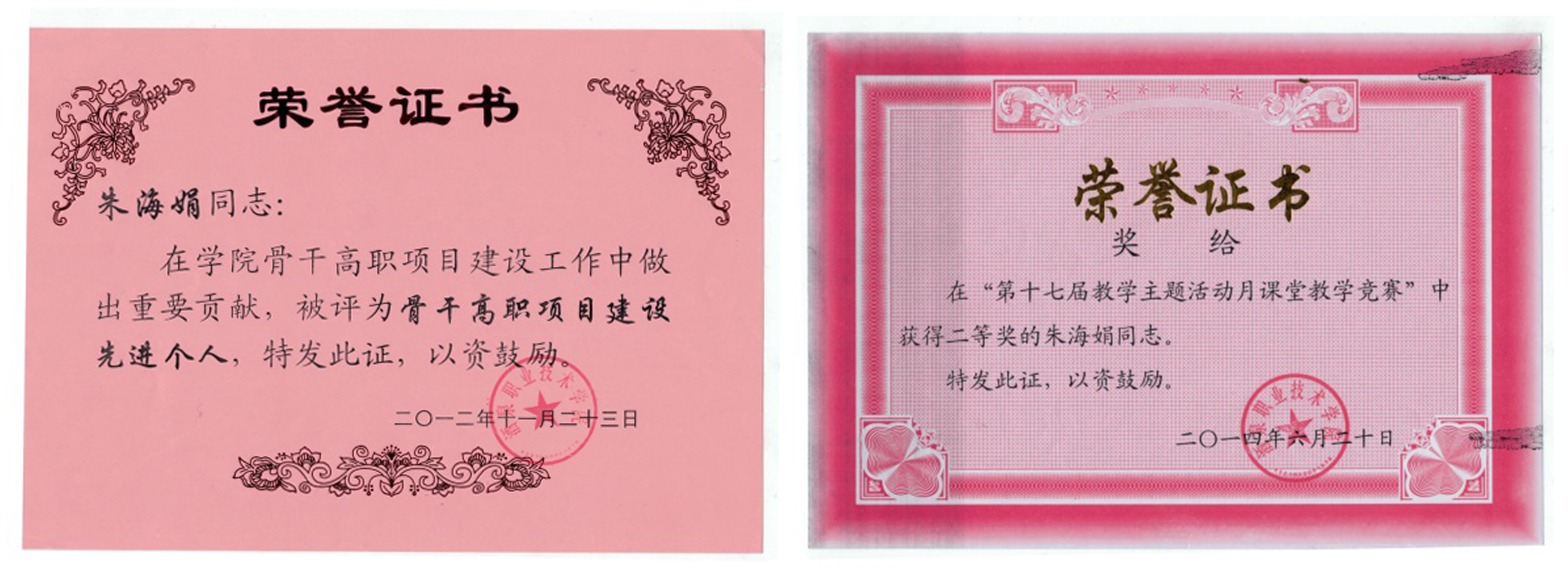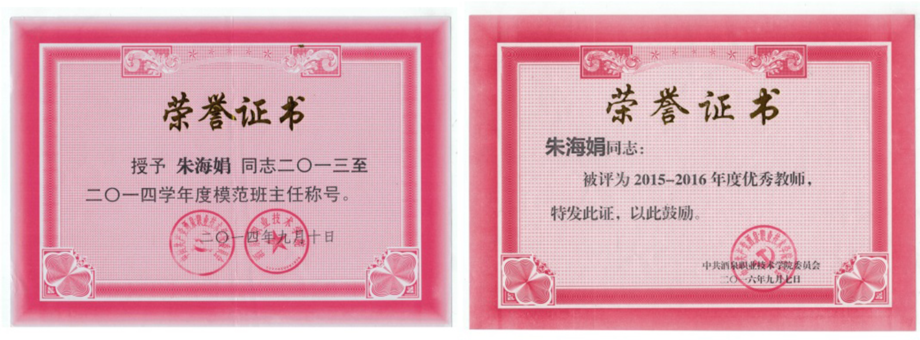 近年来,朱海娟老师先后被学校评为“优秀教师”“骨干高职项目建设先进个人”“模范班主任”等;本年度,更是从众多精英中脱颖而出,荣获首届“师德标兵”称号。很多学生——特别是那些事业有成的学生,时隔多年也还念念不忘当年朱老师给予他们的教导与帮助。也许,相比那些“纸上的荣耀”,学生的真情感怀,才是她莫大的欣慰……